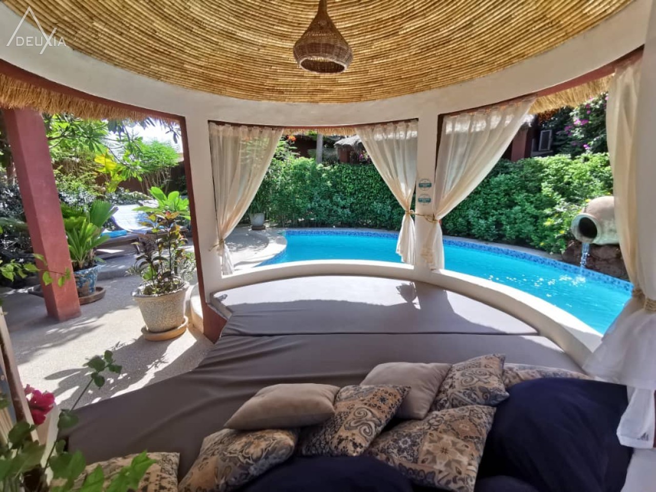 - Autour de la piscine en forme de haricot, un kiosque spacieux et des transats disposés avec soin, offrant à chacun son intimité et permettent de se relaxer.